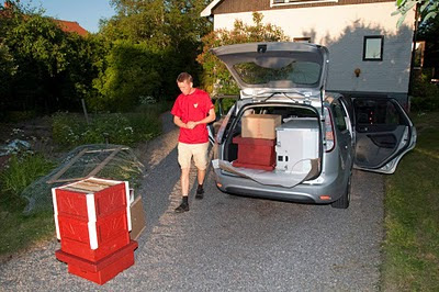 Det krävs en del logistik när man bor på ett ställe, har två bigårdar på annat håll och slungar på ytterligare ett. Här ska jag till föreningens slungrum för att slunga ur ramar, samtidigt som jag passar på att ta med mig ett kylskåp som ska hem för att användas vid kristalliseringen av honung.
